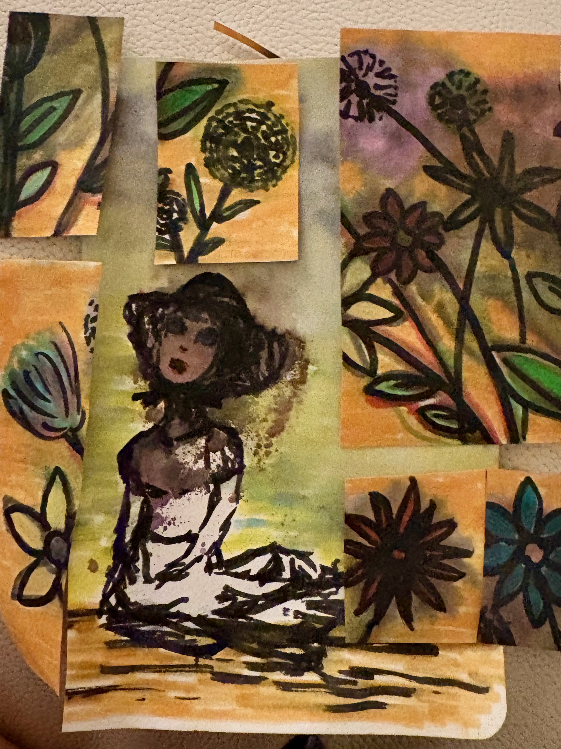 I began by looking back through my art journal at some recent work. I did some colouring, cutting, and rearranging. The image you see here captures a moment from that process. I wrote down some keywords I associated with the image and then, rather than trying to logically figure any of it out, I put it away, giving myself time and space before revisiting it.